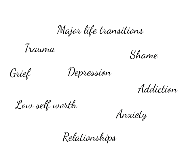 Whether you are experiencing relationship challenges, trauma, depression, anxiety, addiction, shame, low self-worth, grief or major life transitions, I am here to support you.
